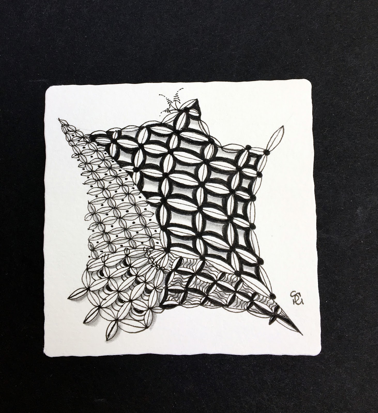 This week the DIVA has us doing a tile with equal parts black and white (ebony & ivory). When the challenge came out, I knew I wouldn't be able to get to it until later in the week due to appts, etc. So, as the week went on I thought about how I was going to do this challenge....use tangles that had a nice balance of black and white, or use both a black and white pen. I will admit, I am not crazy about how my work with the white gelly roll pens looks on the black tiles, but it has been awhile so I thought it was time to try again. I even broke out a new pen to see if that would help! I remembered Maria's words of wisdom...use a lighter touch then with the Micron's, or just tickle the paper. It's true the pens work better when you do that, but that technique can be hard to get down for the heavy handed, like me. I will have the opportunity to try this more, since I just got my new Black Zendala set in the mail yesterday! Here is my contribution for this challenge: